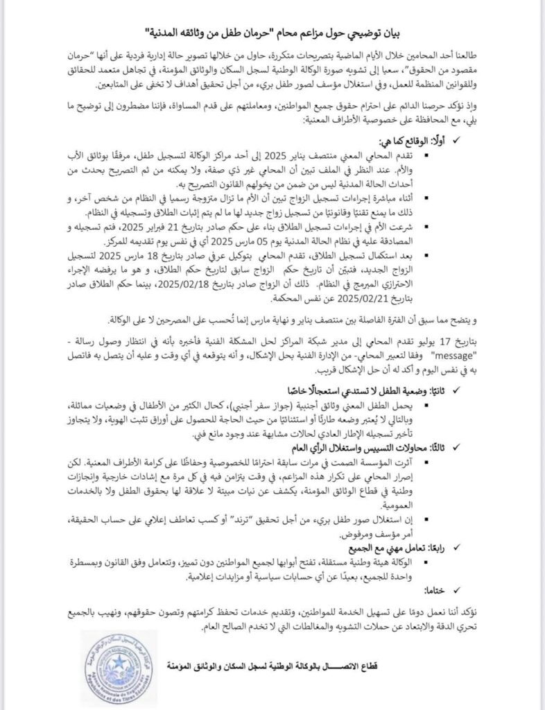 وقالت الوكالة، في بيان توضيحي، إن ما جرى “لا يتعدى كونه وضعية إدارية فردية خضعت للإجراءات القانونية، ولا علاقة لها بأي تمييز أو استهداف”، مؤكدة أن المحامي “حاول تقديم الملف دون استيفاء الشروط القانونية، مستنداً إلى وثائق غير مكتملة أو غير مطابقة”.